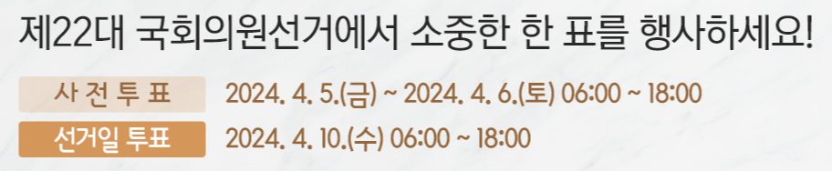 - 사전투표 일정 : 2024. 04. 05(금) ~ 06(토) 매일 오전 6시 ~ 오후 6시